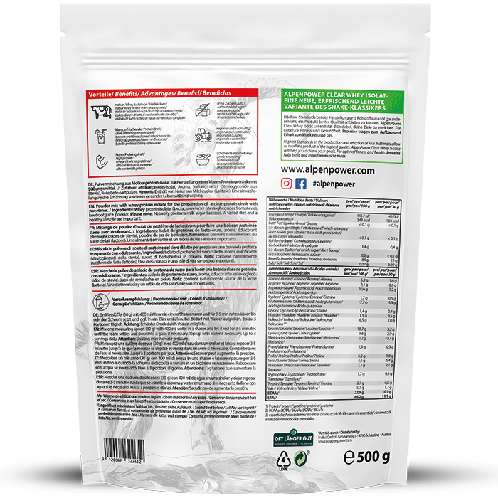 Mix one measuring spoon (30 g) with 400 ml of water in a shaker and wait until the foam has dissolved. You can also pour the Clear Whey into a glass. For an absolute fresh kick, place the shaker immediately in the refrigerator for 20 minutes. Alternatively, you can also stir the powder directly into the water and do not shake. Attention: Increased pressure is possible by shaking.