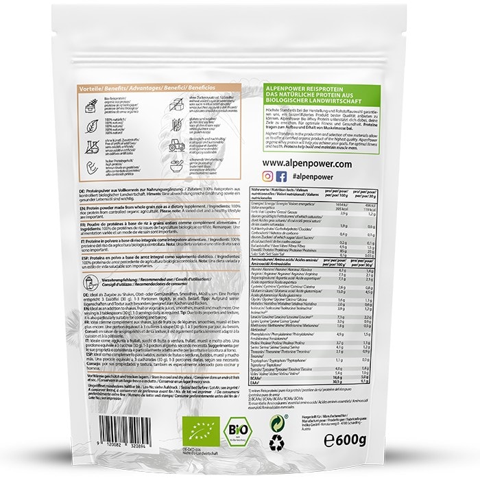 Rice protein is hypoallergenic and therefore ideal for those who have to do without dairy or soy products due to allergies and food intolerance. Rice protein is full of vital substances, minerals and trace elements and the protein content is at a peak of 85%. The values for muscle building so important branched chain amino acids (BCAA) are also very high. It can be used in many ways and can be easily integrated into the daily routine.