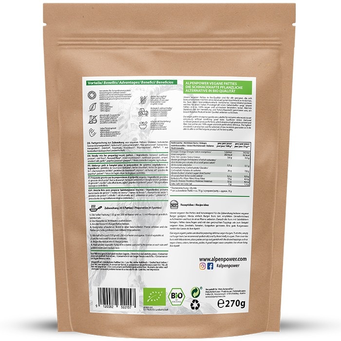 Our vegan organic patties ready mix offers creativity – quick and easy preparation of burger patties, patties and more. The ready-mix is suitable for everyone who wants to eat consciously without sacrificing good taste. Sunflower mince (textured sunflower protein) serves as the basis, which ensures a high protein content and fiber. The mushrooms come from our own Austrian cultivation. With our special mix of high-quality spices, our burger patties are particularly tasty and aromatic. The textured sunflower protein as well as the chopped mushrooms ensure the right bite. 70 g of the vegan patty have only 82 kcal, while conventional beef patties have around 150 kcal. The patties also contain far less fat (0.9 g compared to 10.5 g per patty) and are characterized by a high protein and fiber content. The preparation is also very easy, just mix the ready-mix with a little water and vegetable oil and let it rest for a moment. Then shape burger patties as you like and fry them with vegetable frying oil in a pan until golden brown or just throw them on the grill.