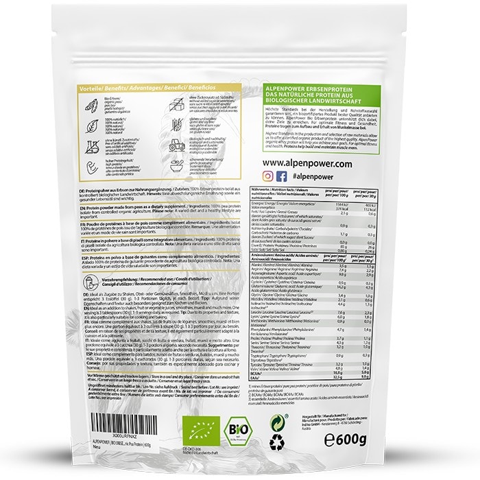 Unser Erbsenprotein ist eine allergenarme, rein pflanzliche und eisenreiche Proteinquelle. Es besteht aus einer sehr hochwertigen Kombination aus essentiellen und nicht essentiellen Aminosäuren, welche Muskelaufbau und Muskelregeneration fördert. Erbsenprotein eignet sich für alle, die den täglichen Eiweißbedarf mit Hilfe von pflanzlichen Produkten decken möchten. Höchste Standards bei der Herstellung und Rohstoffauswahl garantieren uns, ein biozertifiziertes Protein bester Qualität anbieten zu können. Frei von Lektinen (0,05 mg / kg ).