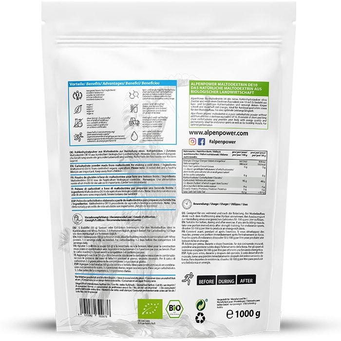 Unser Bio Maltodextrin DE 10 ist dein perfekter Begleiter für intensive Trainingseinheiten und Wettkämpfe. Hergestellt in Österrerich aus biologisch angebautem Mais, bietet dieses leicht verdauliche Kohlenhydrat eine schnelle und nachhaltige Energiequelle, die speziell für Sportler und aktive Menschen entwickelt wurde. Es ist beinahe geschmacksneutral (schwach süßlich), löst sich sehr gut in Wasser und lässt sich hervorragend mit anderen Getränken kombinieren. Bio Maltodextrin DE 10 ist die natürliche, schnelle Energiequelle für Sportler, die Wert auf Qualität und Leistung legen. Egal, ob für Ausdauersport oder Kraftsport – unser Bio Maltodextrin unterstützt dich dabei, deine sportlichen Ziele zu erreichen.