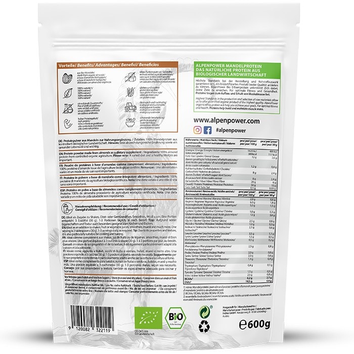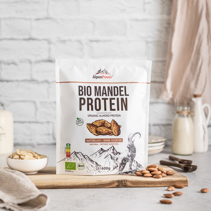 Mandeln sind reich an Vitamin B, Vitamin E, Magnesium, Calcium und Kalium. Durch das Verhältnis von Magnesium und Calcium werden die Mineralstoffe vom Körper sehr gut aufgenommen und verwendet. Das Mandelprotein kommt völlig ohne künstliche Zusatzstoffe oder Süßstoffe aus und überzeugt mit seinem nussigen Geschmack. Es werden nur beste Bio-Mandeln zu unserem Protein verarbeitet – 100 % Mandeln, sonst nichts. Das Mandelprotein eignet sich besonders als Backzutat, bildet für viele vegane Rezepte eine hervorragende Grundlage und ist auch für eine Low-Carb-Ernährung bestens geeignet – wahrlich ein Protein-Allrounder in der Küche.