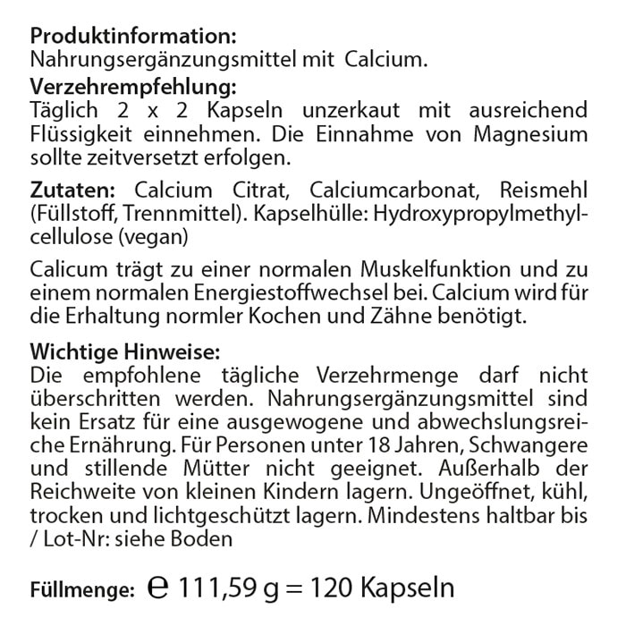Calcium ist ein elementarer Mineralstoff für unseren Körper und unerlässlich für gesunde Knochen und Zähne. Etwa 99% des im Körper vorhandenen Calciums befinden sich in diesen Geweben, wodurch sie Festigkeit und Struktur erhalten. Calcium ist nicht nur gut für unsere Knochen, sondern auch unverzichtbar für die reibungslose Funktion der Muskeln und einem normalen Energiestoffwechsel. Durch unsere speziell entwickelte Formel mit Calcium-Citrat und Calcium-Carbonat wird eine optimale Aufnahme des Calciums durch den Körper gewährleistet.