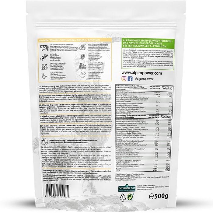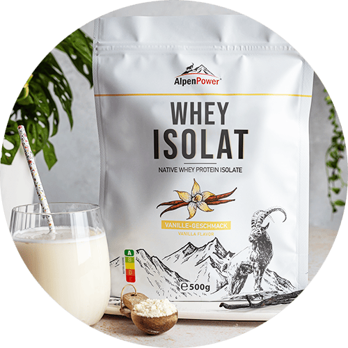 AlpenPower Natives Whey Isolat überzeugt durch einen sehr hohen Proteingehalt von ~ 90 % bei einem geringen Fett- und Kohlenhydrat-Anteil. Dadurch ist unser Whey Isolat besonders rein und wird noch schneller vom Körper aufgenommen als herkömmliches Whey-Konzentrat. Unser natives Whey Isolat wird direkt aus der Milch mittels schonender Cross Flow Microfiltration (CFM) gewonnen, enthält wenig Laktose und ist daher besonders gut verträglich. Jede Portion liefert reichlich Protein, um die Muskeln nach dem Training optimal zu versorgen und den Muskelaufbau zu unterstützen. Höchste Standards bei der Herstellung und Rohstoffauswahl garantieren uns, ein hochwertiges Premium Protein bester Qualität anbieten zu können.