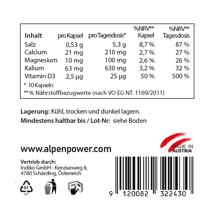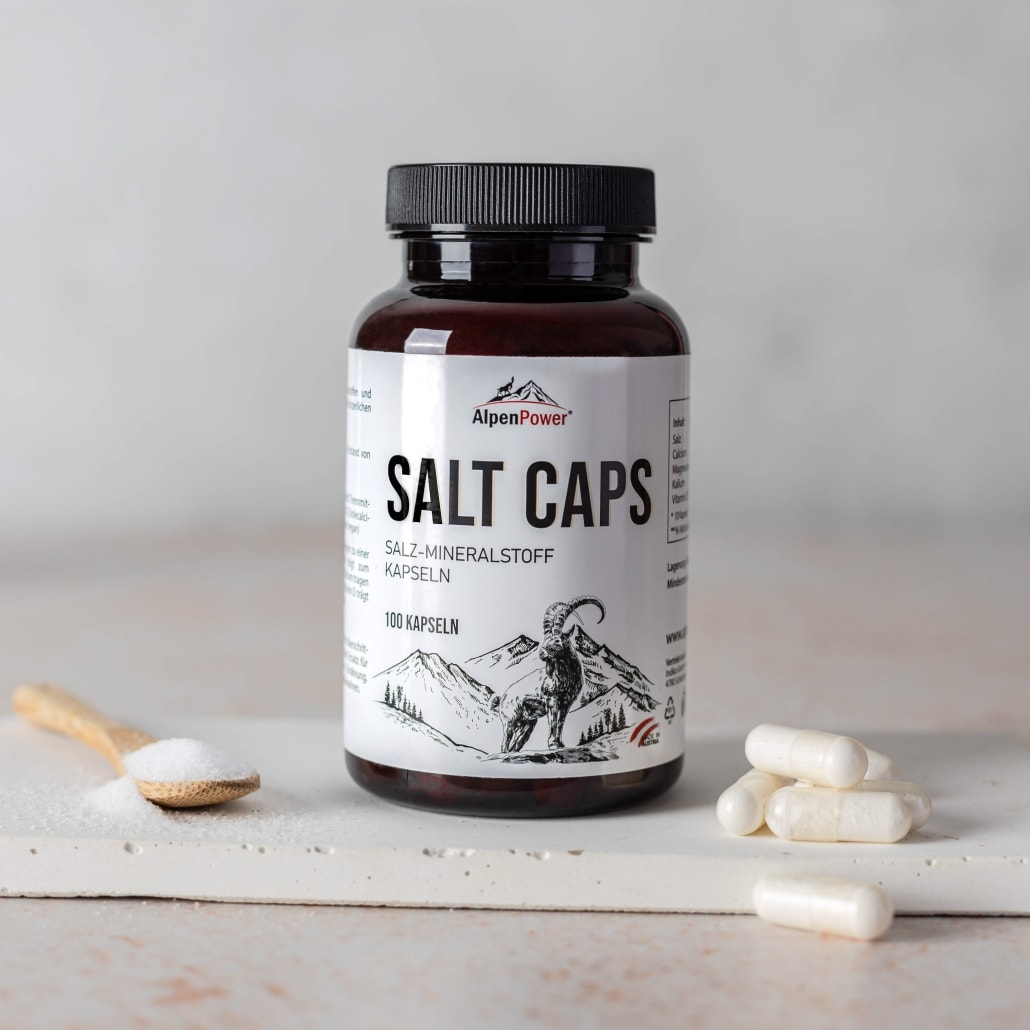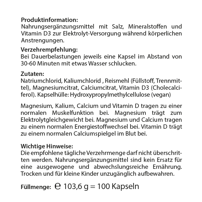 Immer mehr Ausdauersportler greifen auf Salztabletten oder Mineralstoffkapseln zurück, um ihre Leistungsfähigkeit zu gewährleisten. Vor allem bei Ausdauerbelastungen ist eine Versorgung des Körpers mit wichtigen Elektrolyten einer der leistungsbestimmenden Faktoren. Über den Schweiß gehen viele wichtige Mineralstoffe wie Salz (Natrium) verloren. Werden diese nicht rechtzeitig in ausreichender Menge zugeführt, droht ein Leistungsabfall und vor allem gefürchtete Muskelkrämpfe. Die Kombination von Salz und der speziell abgestimmten Mineralstoff-Formel gleichen einen Elektrolyt-Verlust durch Schwitzen bei körperlicher Anstrengung optimal aus. Die vegane Kapselhülle sorgt zudem für eine hohe Bioverfügbarkeit.