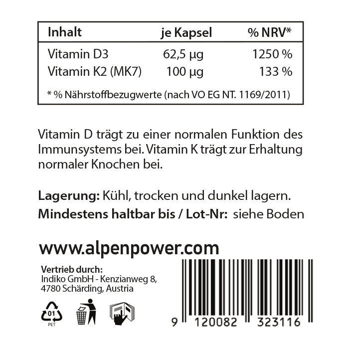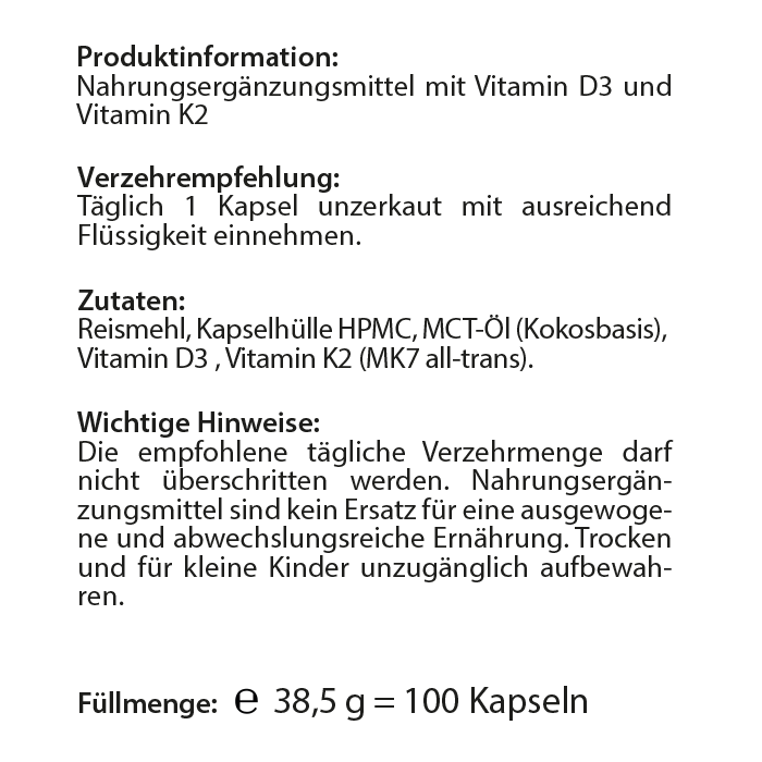 Reismehl, Kapselhülle (Hydroxypropylmethylcellulose-vegan) , MCT-Öl (Kokosbasis), Vitamin D3 , Vitamin K2 (MK7 all-trans).