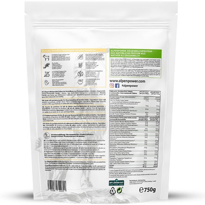 Gleich vorweg, Ziegenprotein schmeckt bei weitem nicht so intensiv wie ein Ziegenkäse, sondern ist im Geschmack angenehm und der Ziegenmilchgeschmack ist nur leicht wahrnehmbar. Es hat eine ähnliche Textur wie Casein und kann somit auch sehr gut auch zum Backen verwendet werden. Die Milch für unser Ziegenprotein stammt ausschließlich von Bauern aus Österreich, die ihre Tiere auf artgerechten Weiden halten, großteils auf Almen im Alpenraum.