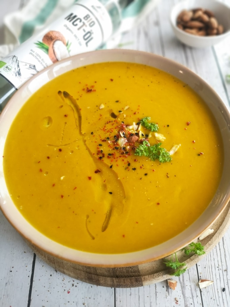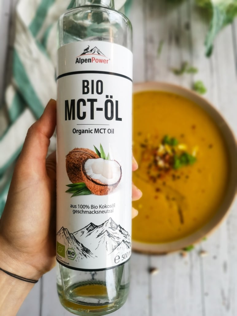 Perfekt für eine warme Mahlzeit: Blumenkohl Curry Suppe mit BIO MCT-Öl, ein Rezept von Michaela Mayr.