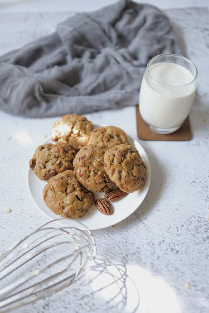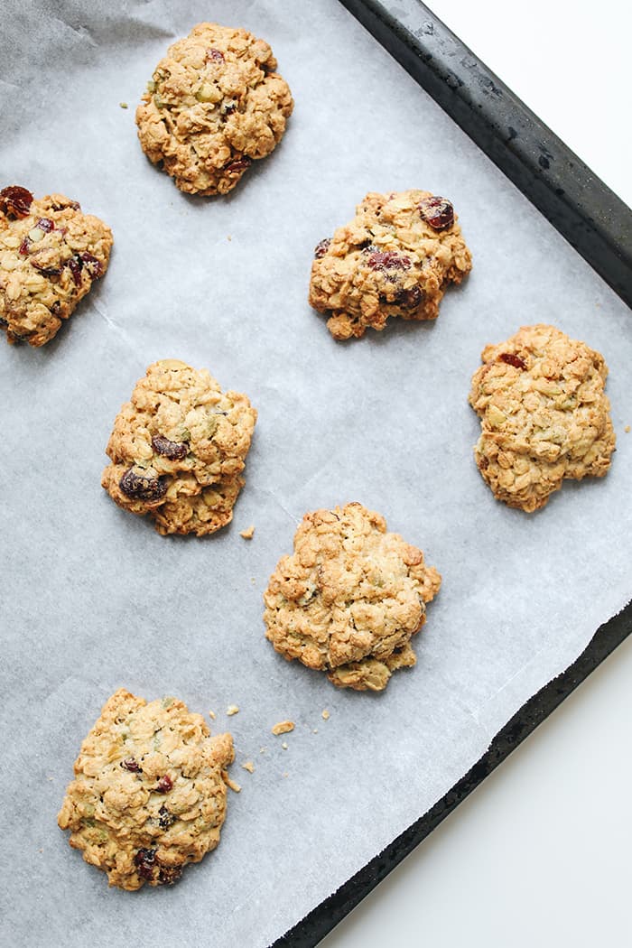 Mit einem Löffel Teigportionen formen und mit den Fingern flach drücken. Für etwa 15 Minuten im Ofen goldbraun backen.