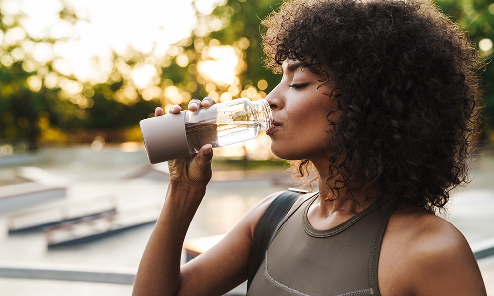 Auch bei Sport kann der Flüssigkeitsbedarf stark ansteigen. Durch Schwitzen verlieren wir Wasser und Salze, die über Getränke wieder zugeführt werden müssen. Bei Belastungen bis max. 60 Minuten ist keine Flüssigkeitszufuhr währenddessen notwendig. Bei Einheiten bis zu 90 Minuten solltest du alle 15 bis 20 Minuten 100 bis 200 Milliliter Wasser trinken (pro Stunde also 0,4 bis 0,8 Liter). Über 90 Minuten sollte es ein Sportgetränk mit Kohlenhydraten sein.