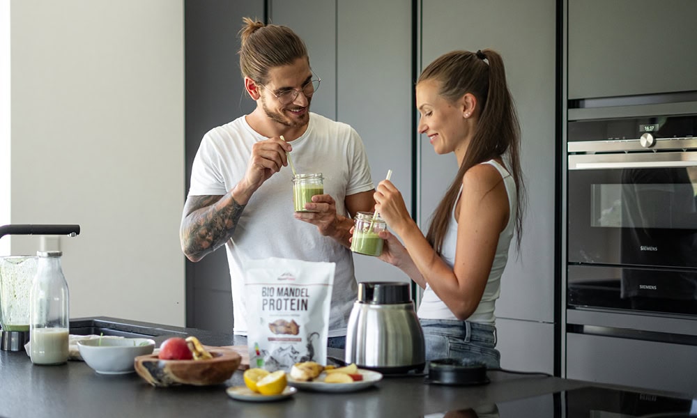 Hast du noch Fragen zum Thema Protein? Unsere Ernährungsexpertin Michaela teilt im Podcast „Michaelas – Am Küchentisch“ einen groben Faktencheck zu Proteinpulver und ihre Einschätzung zu veganen Alternativen. Hier lang.